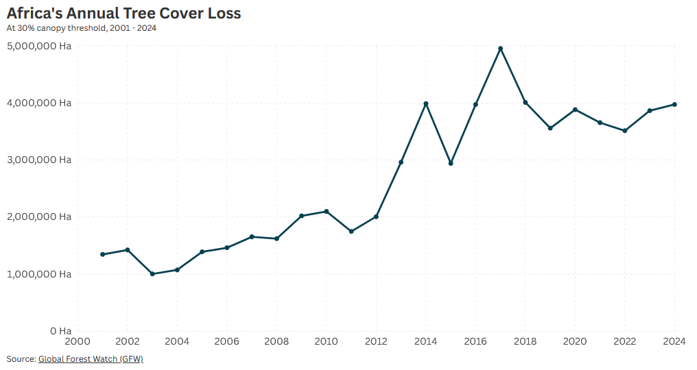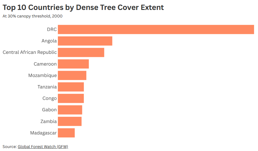 Western Africa has suffered the heaviest proportional losses, losing over a quarter of its dense forest (25.57%), while Central Africa remains more stable, with 7.93% lost, largely buffered by the sheer size of the DRC’s forests.